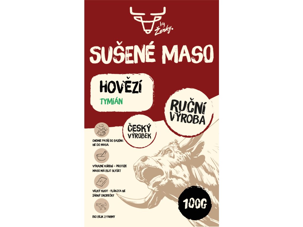 Složení: Hovězí kýta 89%, Sójová omáčka 8% (voda, sójové boby, pšenice, jedlá sůl), Jablečný ocet 2,5% (pitná voda, ocet kvasný jablečný, obsah kyseliny octové 5 g/100 ml), Tymián sušený 0,25%, Sůl 0,25%