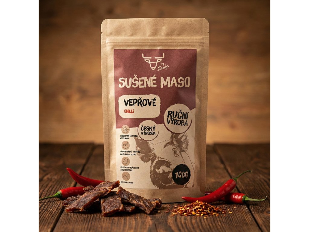 Naše vepřové sušené maso je symbolem lahodnosti a kvality. Používáme pouze to nejkvalitnější vepřové maso, které je šetrně kořeněné a pak pomalu sušené, aby se zachovala jeho přirozená šťavnatost a chuť. Každý kousek je pečlivě kontrolován, abychom zajistili konzistentní kvalitu a chuť. S balením po 50 nebo 100 gramech je naše vepřové sušené maso ideálním doplňkem k vašim dobrodružstvím v přírodě nebo prostě jen jako chutná svačina do práce.